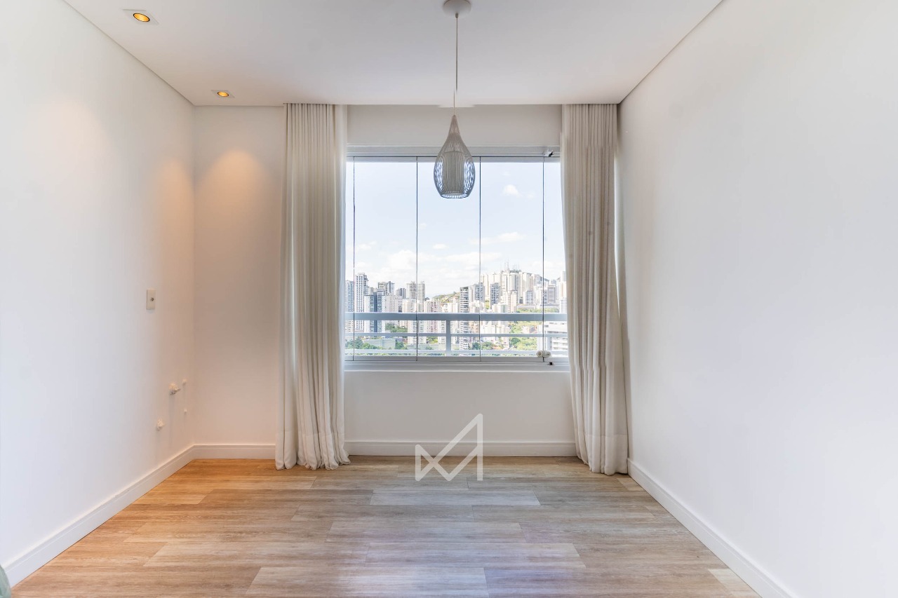 Na Vila da Serra, um apartamento de 74m² onde a planta organiza o essencial com precisão. A sala com vista conduz o ambiente social. Luz natural, horizonte aberto e uma leitura clara do espaço.