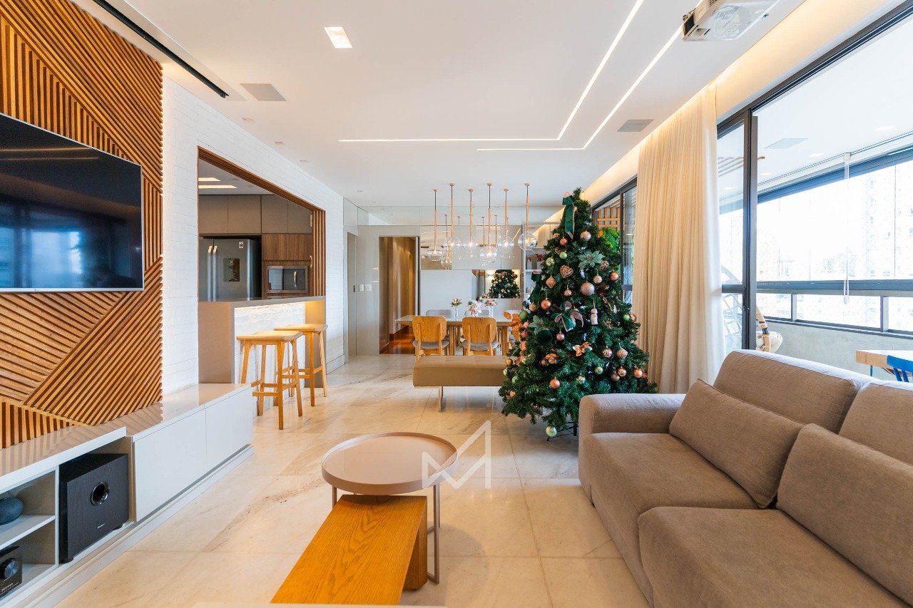 A cozinha planejada se integra à dinâmica do apartamento com desenho preciso e soluções que favorecem o dia a dia, sem excessos.
