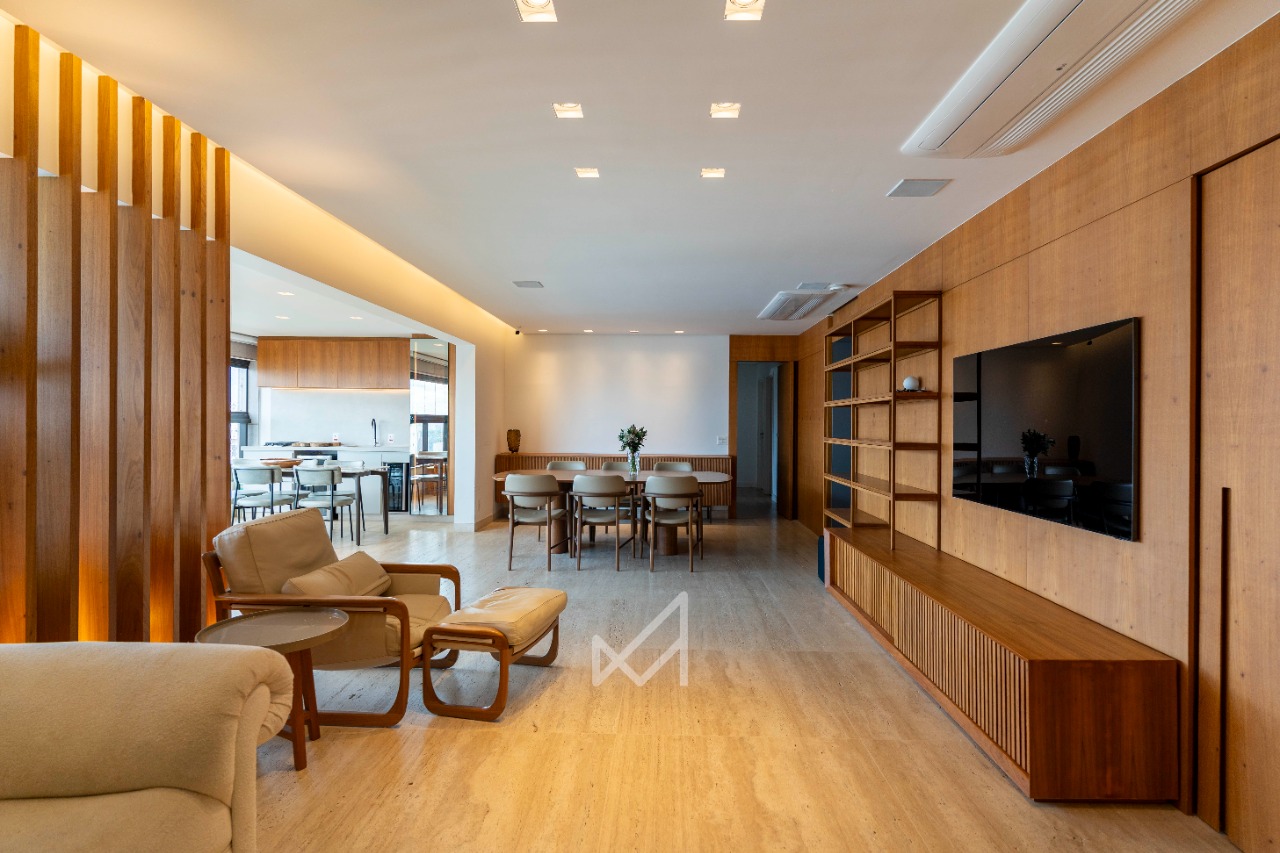 Com 4 quartos e 3 banheiros, a planta privilegia ambientes bem distribuídos e circulação fluida. A sala integrada ao espaço gourmet no próprio apartamento amplia as possibilidades de convivência, criando um cenário natural para receber. A vista panorâmica acompanha o ambiente social, trazendo profundidade e luz ao cotidiano.