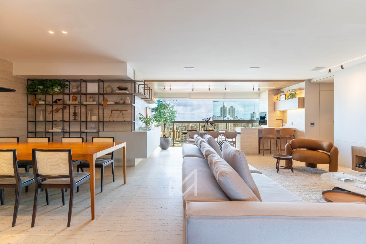 A sala ampla com vista panorâmica conduz a área social, trazendo luz natural e um horizonte presente no cotidiano. Os armários embutidos organizam a rotina com praticidade e aproveitamento eficiente dos ambientes.