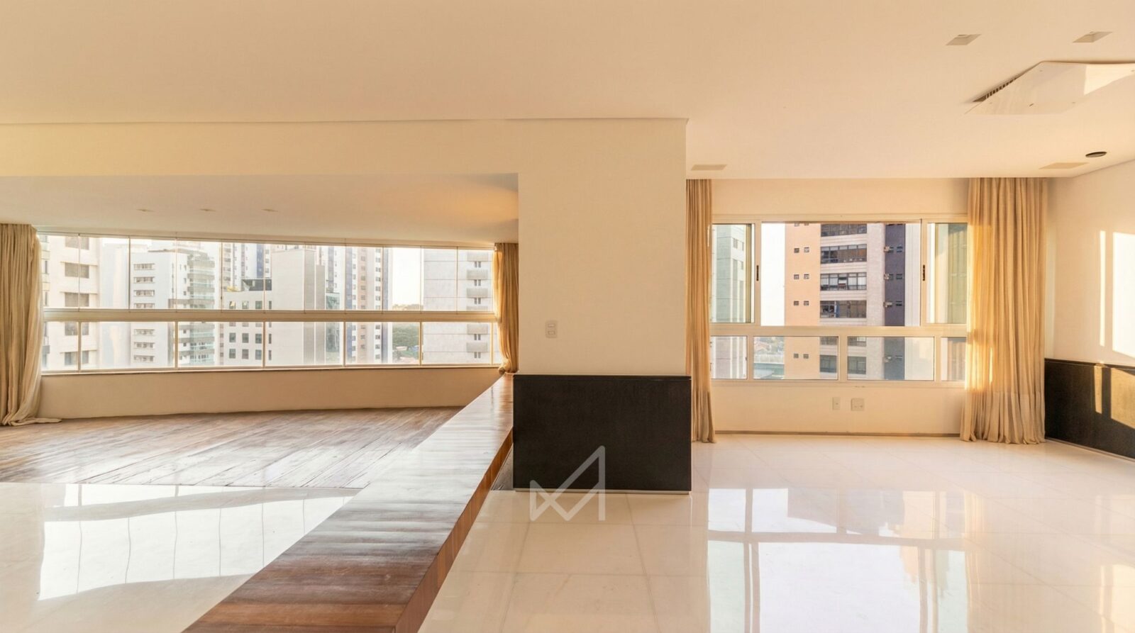No Belvedere, um apartamento de 213m² onde a sala ampla com vista para a cidade conduz a experiência do imóvel, trazendo luz e horizonte para o ambiente social.